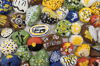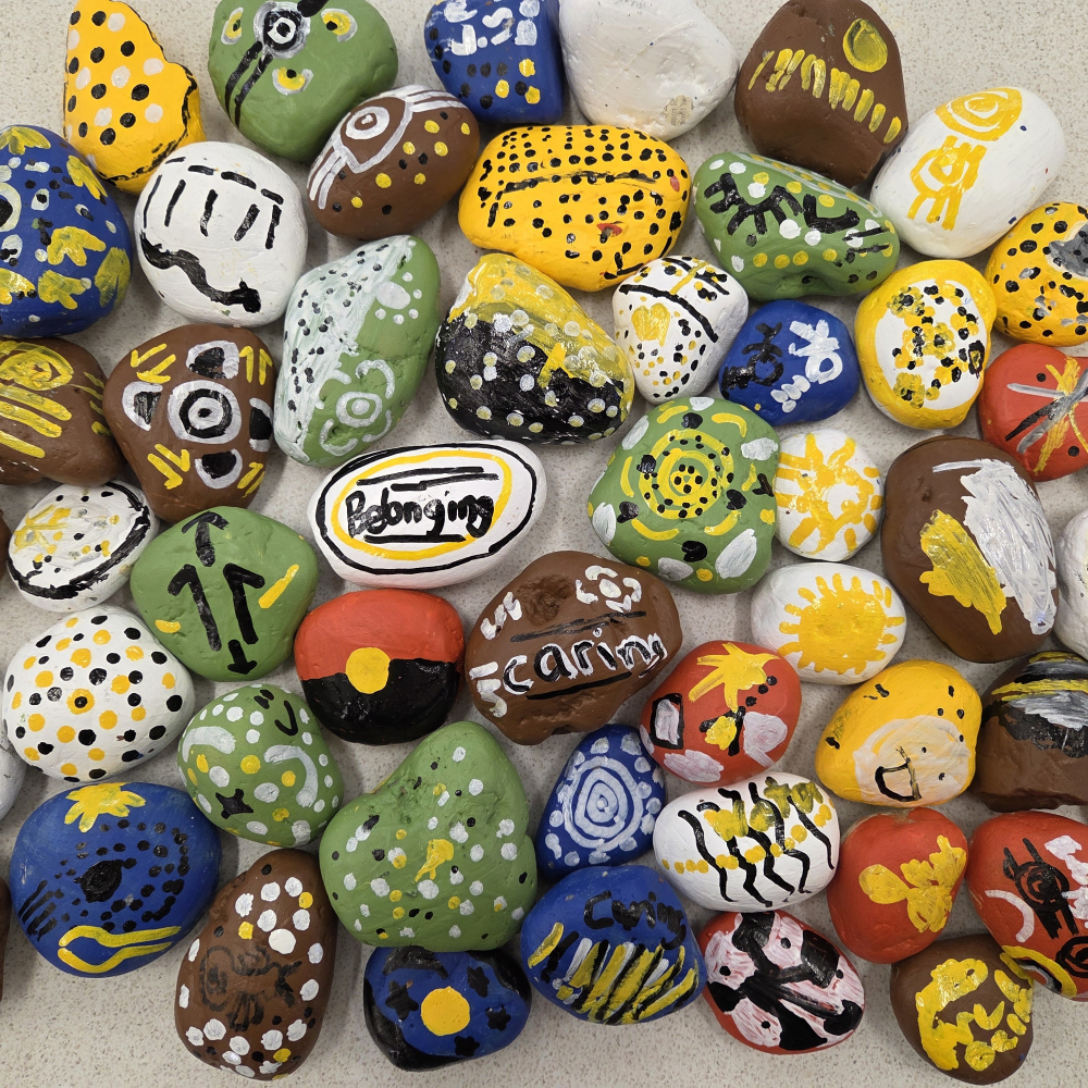 Another project at Loxton Primary School is the creation of a rock wall. This initiative has involved all staff and students, who have each painted a river rock with Aboriginal symbols, the School's Values, or their own personal symbols. These painted rocks will be carefully arranged and glued onto the front wall of the Bush Tucker Garden, artistically mimicking the shape of the Murray River. This project not only enhances the visual appeal of the garden but also symbolises the unity and diversity of our school community.