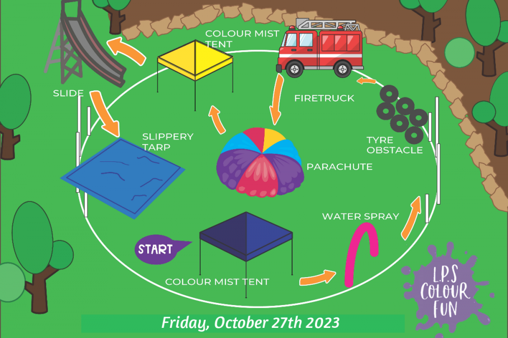 An exciting obstacle course is set up on the school oval and students take delight in running around the course, all the while being covered in Colourfun powder and water.